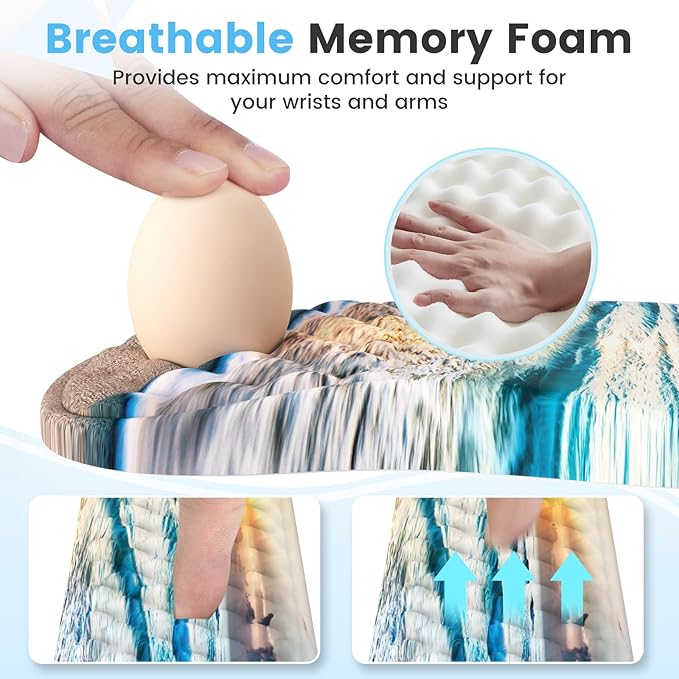 - Improved Ergonomic Design:8-degree slope keep arms maintaining in proper alignment. The wrist can be fully supported on the arched part. Feel like on a comfortable soft pillow. Reduce wrist pressure and avoid carpal tunnel typing pain. The ergonomic mouse pad with wrist support and keyboard hand rest adopts 100% memory foam. Not easy to deform or infiltrate over time like a gel.
