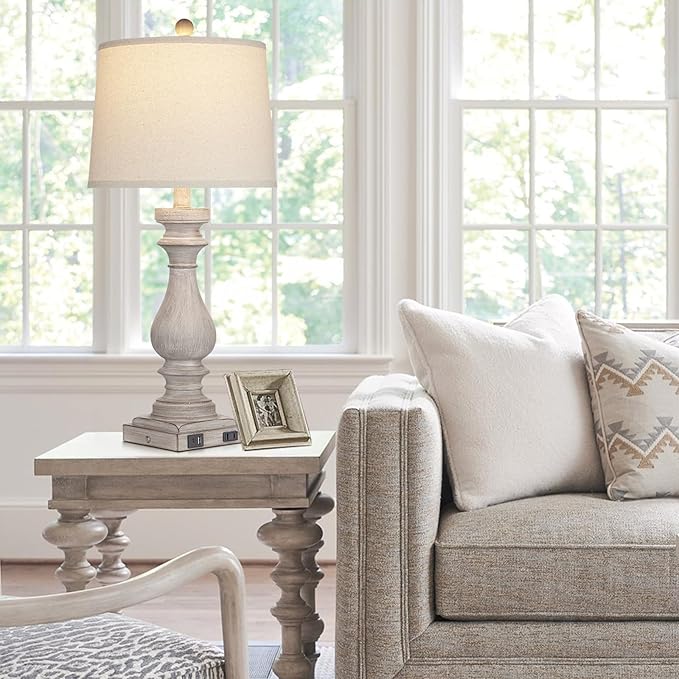 27.5" Farmhouse Table Lamp for Living Room Set of 2,Vintage Bedside Lamps with USB C+A Ports & AC Outlet,3-Way Dimmable Touch Control Gray Washed Finish Nightstand for Bedroom, Gray