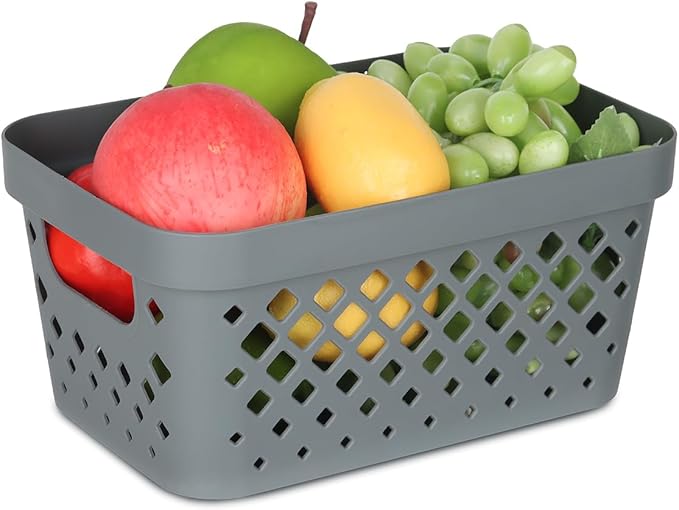 - BULK BASKETS PACK OF 6 – Open plastic baskets come nested. Baskets have side handles to easily pull out of shelves and carry. Each basket holds 1 gallon (4 liters) and measures 6.625”D x 10.125”W x 4.75”H overall. Set includes 6 grey baskets.