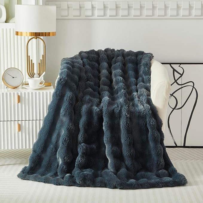 Faux Fur Throw Blanket for Couch Cozy Fuzzy Soft Plush Thick Fluffy Fleece Bubble Blanket for Sofa Bedroom Living Room, 51x63 Inches Dark Grey