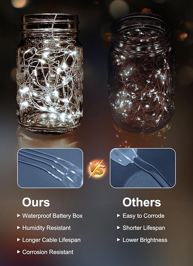 - Portable & Waterproof Design – These battery-operated fairy lights are perfect for areas without outlets or during power outages. Featuring an IP44 waterproof battery box and durable LED bulbs, they shine brightly even in wet weather—ideal for Christmas, weddings, and outdoor décor