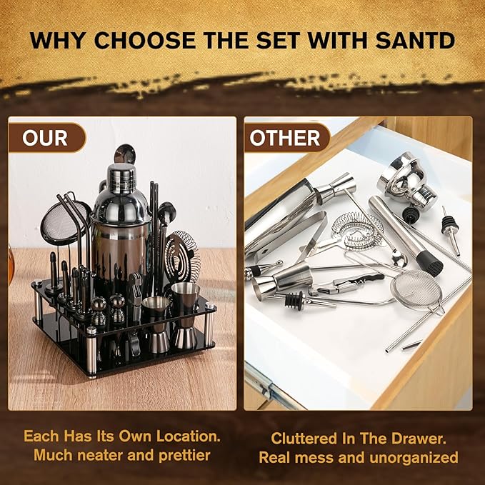 - 🍸【Easy to Display & Storage】Bartender kit with Acrylic stand, keep your barware scratch-safe, organized, and accessible. Save your space, No more clutter in your kitchen drawers and cabinets, and avoid lost tools. When there are guests, you'll be able to proudly display your cocktail kit.
