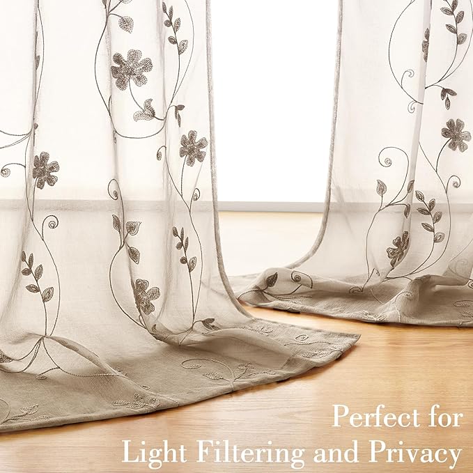HOMEIDEAS Taupe Sheer Curtains 63 Inches Length 2 Panels Beige Embroidered Floral Pattern Semi Sheer Window Curtains for Bedroom Living Room