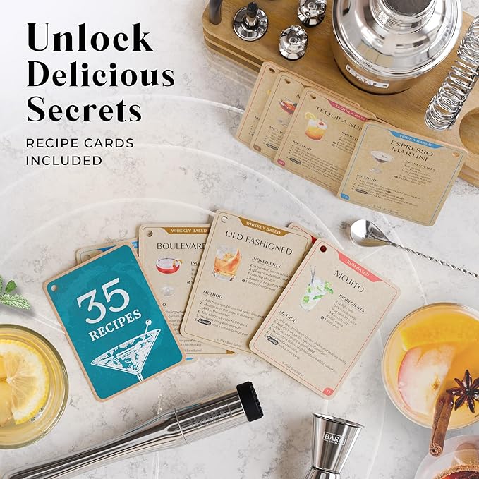 BARE BARREL® Mixology Bartender Kit Bar Set | 14-Piece Cocktail Shaker Set | Martini Barware Mixing Tools for Home Bartending | 35 Recipe Cards | Gift Set (24oz Cobbler Shaker, Silver/Natural)
