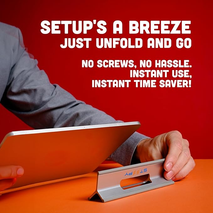 • SETUP'S A BREEZE - Just unfold and go—no screws, no hassle. Instant use, instant time saver! Steepy desk laptop stand is a travel laptop stand made out of strong and durable recycled plastic, with rubber edges to provide the sturdy and stable support your device needs and prevent it from sliding or skidding.