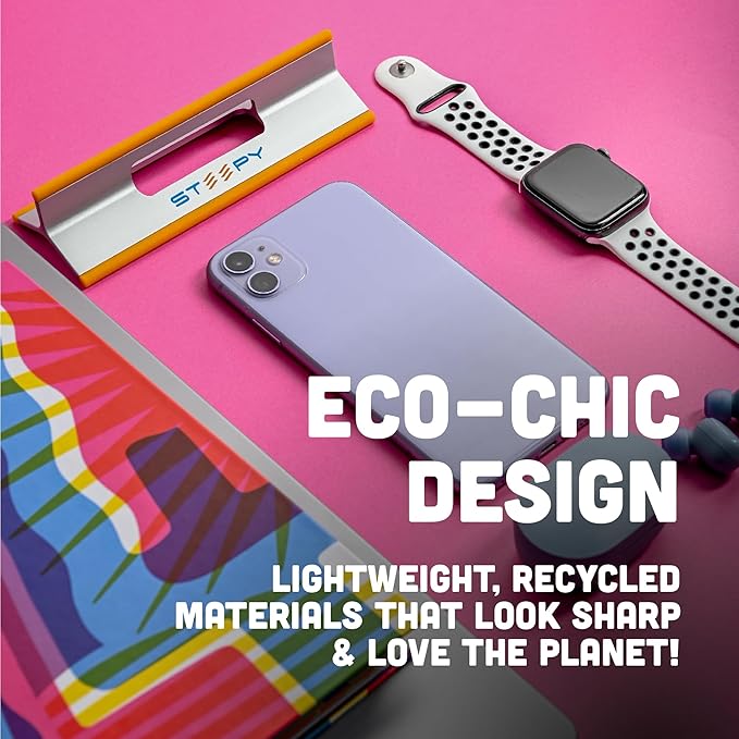 - SETUP'S A BREEZE - Just unfold and go—no screws, no hassle. Instant use, instant time saver! Steepy desk laptop stand is a travel laptop stand made out of strong and durable recycled plastic, with rubber edges to provide the sturdy and stable support your device needs and prevent it from sliding or skidding.