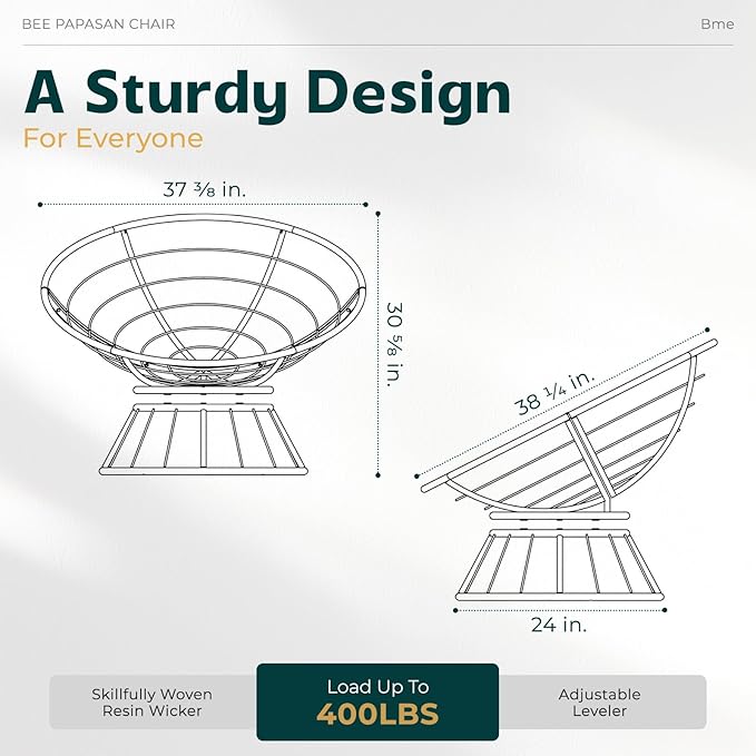 - 360 DEGREE SWIVEL PAPASAN CHAIR: The papasan chair frame is made of solid metal and expertly woven resin wicker; 360 degree swivel papasan chair base has a smoothly rotating structure without noises and friction; Five levelers protect your floor and are easily adjustable for stability of wicker papasan chair