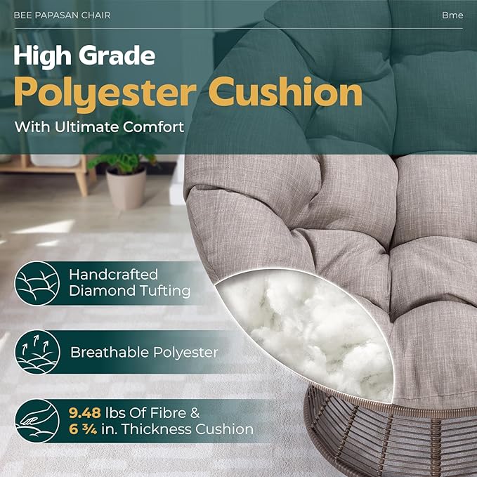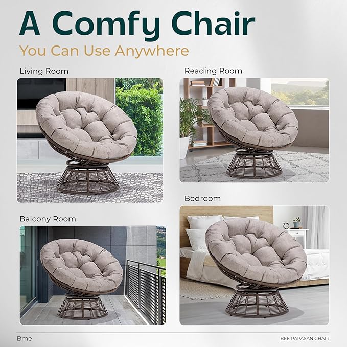 Bme 40" Ergonomic Wicker Papasan Chair with Soft Thick Density Fabric Cushion, Bee-Designed Base, High Capacity Steel Frame, 360 Degree Swivel for Living, Bedroom, Reading Room,...