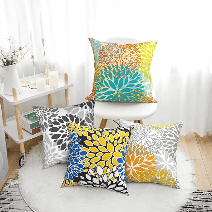 Yellow Teal Dahlia Throw Pillow Covers 18x18 Inch Set of 4 Gray White Floral Cushion Covers Modern Geometric Home Decorative Soft Plush Cushion Cases for Bed Couch Sofa Living Room Decor