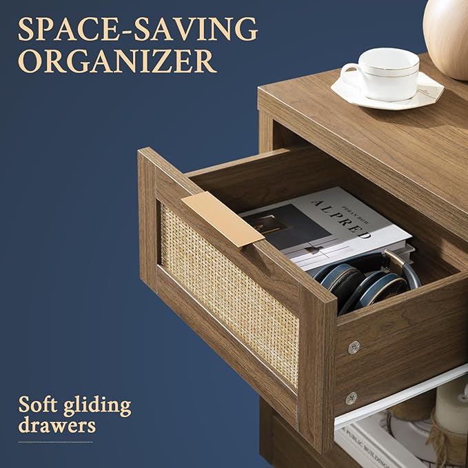 - Rattan Nightstand with Drawers and Open Storage: Rattan-accent drawers combine farmhouse style with practicality. The design of the drawers and open storage provides you with ample space. This design makes storage and access more convenient while also safeguarding the safety of valuables