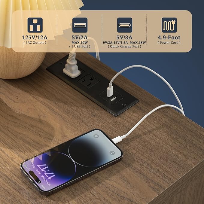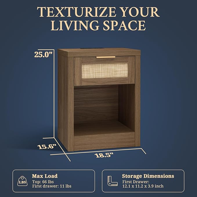 - End Tables Bedroom with Type-C Port Design: The rattan bedside table is equipped with 2 power sockets, 1 Type-C port, and 1 USB port to fully meet your charging needs. The charging ports are conveniently located above the table, making it easy for you to use desk lamps, mobile phones, and other devices. Please note: The modern nightstand height is 25 inches. Confirm if it fits your room before making a purchase