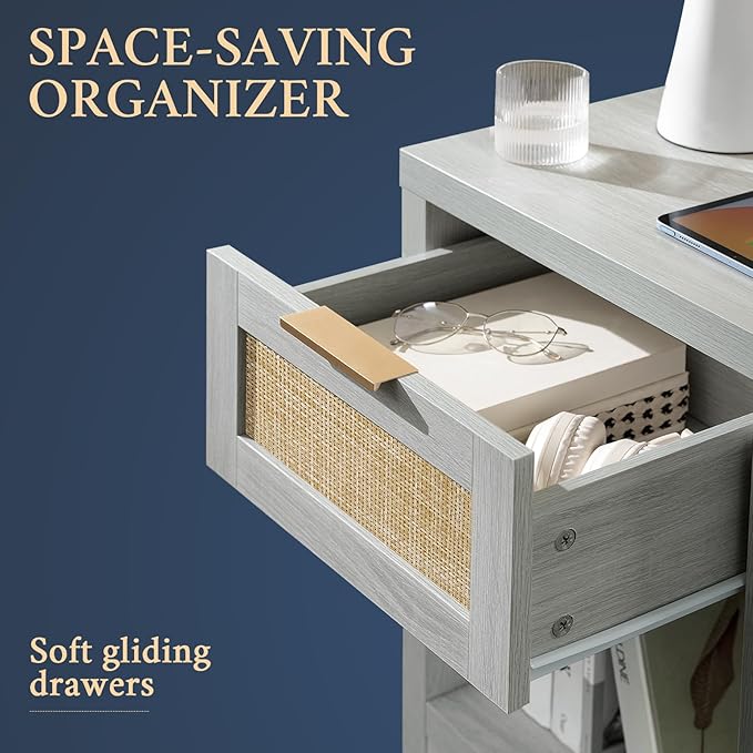 - Rattan Nightstand with Drawers and Open Storage: Rattan-accent drawers combine farmhouse style with practicality. The design of the drawers and open storage provides you with ample space. This design makes storage and access more convenient while also safeguarding the safety of valuables