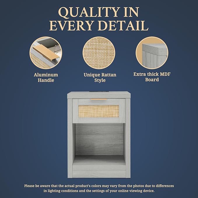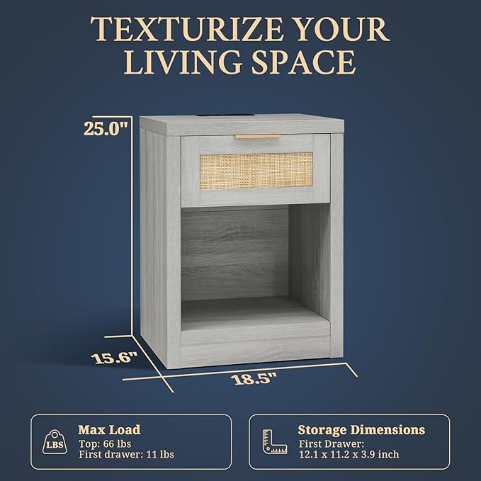 - End Tables Bedroom with Type-C Port Design: The rattan bedside table is equipped with 2 power sockets, 1 Type-C port, and 1 USB port to fully meet your charging needs. The charging ports are conveniently located above the table, making it easy for you to use desk lamps, mobile phones, and other devices. Please note: The modern nightstand height is 25 inches. Confirm if it fits your room before making a purchase