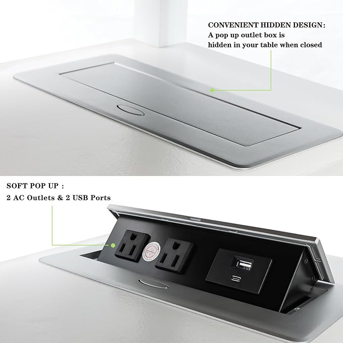 - Built-In Charging Station: Two 3-prong outlets & two USB ports can charge 4 devices simultaneously. The charging station is under the desktop. The flip-top design prevents electric shock and keeps you and your devices safe.