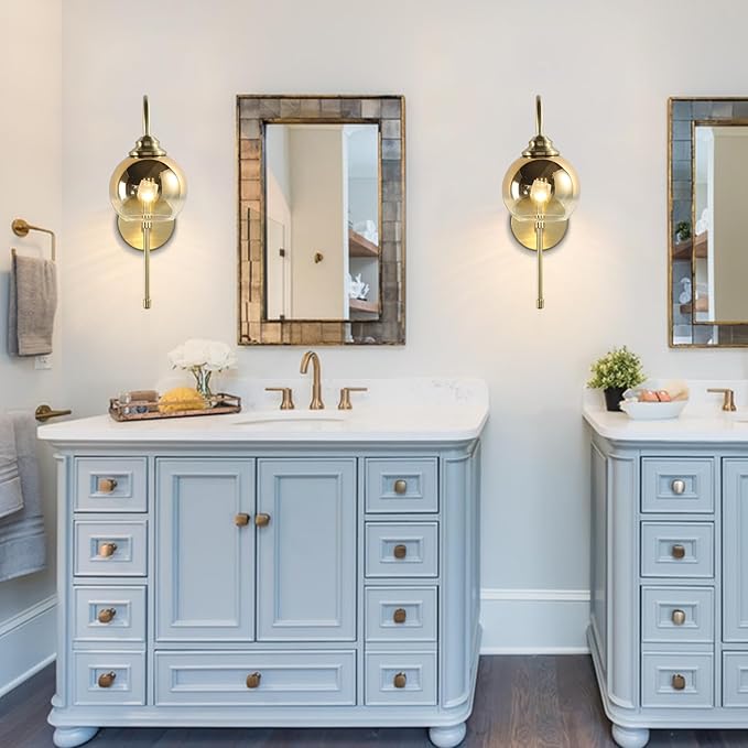 - Armed Sconce with Gradient Gold Lampshade: The bathroom wall mounted light sconce is made of brushed finish arc metal lamp body and gradient gold glass, the glass lampshade is not normal glass, it gradient gold glass shade, which is more attractive than ordinary glass, and emitting a warm and romantic light, to create a romantic home atmosphere. Unique arc design and gradient gold shade sparkle to your interior