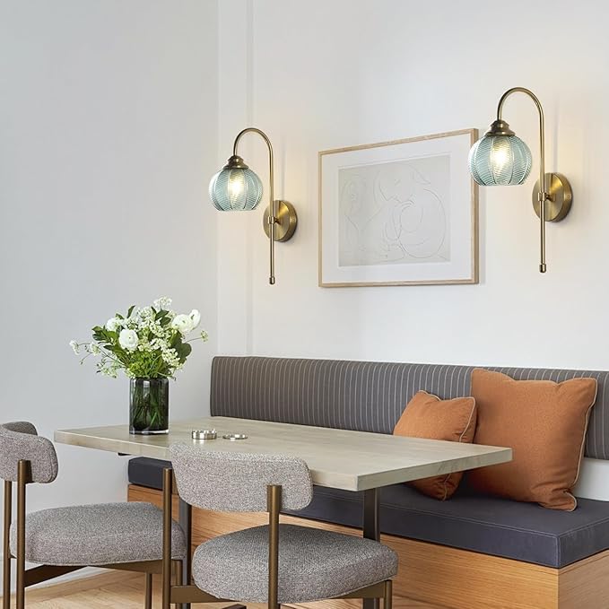 - Mid Century Wall Sconce with Green Lampshade: The bathroom vanity light fixture is made of brushed finish arc metal lamp body and green ribbed glass, the glass lampshade is not normal glass, it’s green ribbed glass shade, which is more attractive than ordinary glass, and emitting a warm and romantic light, to create a romantic home atmosphere. Unique arc design and green ribbed glass shade sparkle to your interior
