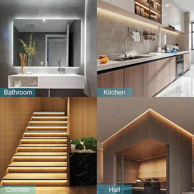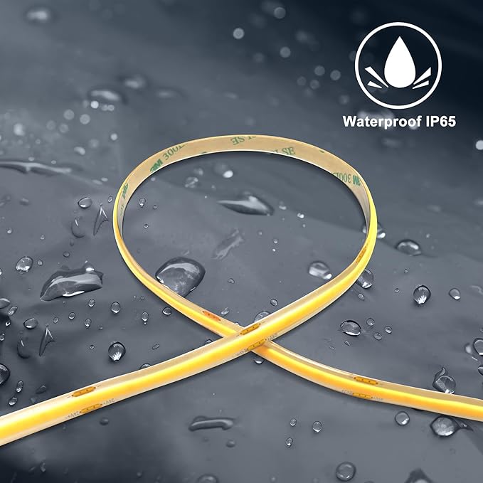 - 1. 【IP65 Waterproof Rating】This 16.4ft COB LED light strip features 1600 LEDs, creating an incredibly uniform lighting effect. With IP65 waterproof and dustproof properties, it is also ideal for use in areas prone to splashes of water, dust, and grease, such as bathrooms or kitchens (Note: not suitable for outdoor use)