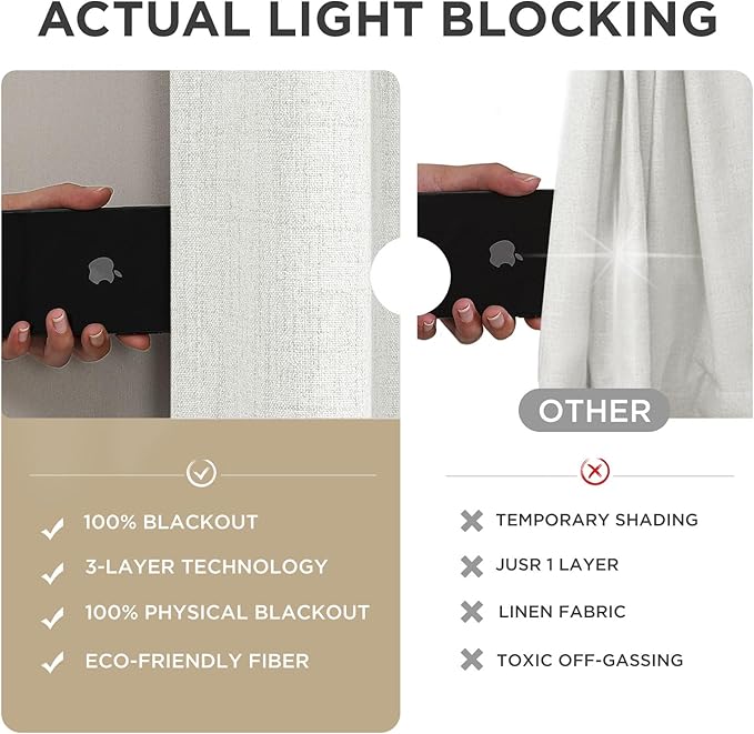 - 100% Total Blackout & UV Blocking: Achieve perfect darkness with these blackout curtains! The dedicated liner blocks 100% sunlight and UV rays, ideal for any bedroom or living room. This blackout curtain protects furniture from fading and helps regulate room temperature year-round.