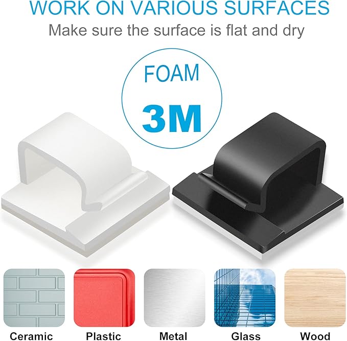 - Strong Adhesive: Those cable management clips have a upgraded sticky adhesive that can firmly hold cables, wires, and cords in place, remove without any residues and damage. Work great on plastic, metal, glass, wood surface.