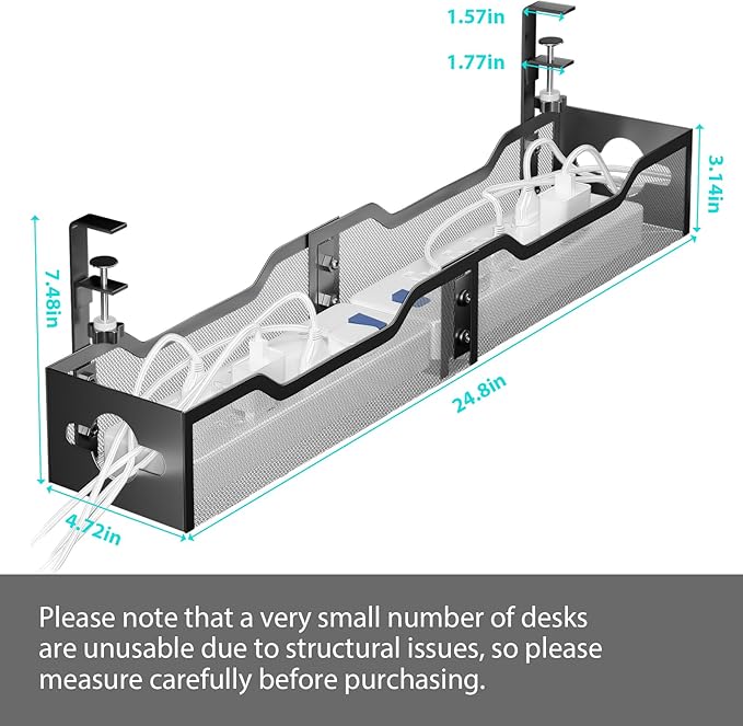 - NO DRILLING REQUIRED - Quszmd under desk cable management rack provides "drill-free installation" option, which adopts clip-on installation method, so you can use this product on all tabletops including standing desks, glass tables, wood, metal tables, etc. Will not leave any marks or damage to your table. But please note that when there are iron wires or other partitions under your table, you need to carefully check whether the size of this product can be installed normally.