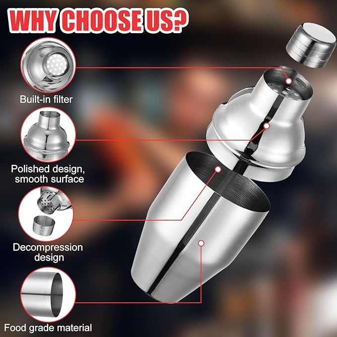 - Quality Material: the drink shakers cocktail set is crafted from stainless steel including 11.8 oz, ensuring a quality build that is resistant to wear, tear, and corrosion; The stainless steel also ensures that your cocktail shaker set will maintain its polished look, providing long lasting elegance in your home or professional bar setup