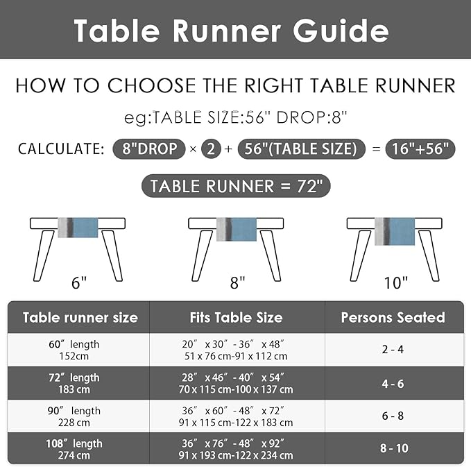 - Suitable Size: Measuring 13 x 72 inches (33 x 183 cm) with a size deviation of 1 to 2 cm, our reusable table runner is designed to fit tables seating 4-6 people. Please measure your table carefully to ensure the proper fit.