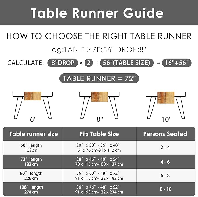 - Suitable Size: Measuring 13 x 72 inches (33 x 183 cm) with a size deviation of 1 to 2 cm, our reusable table runner is designed to fit tables seating 4-6 people. Please measure your table carefully to ensure the proper fit.