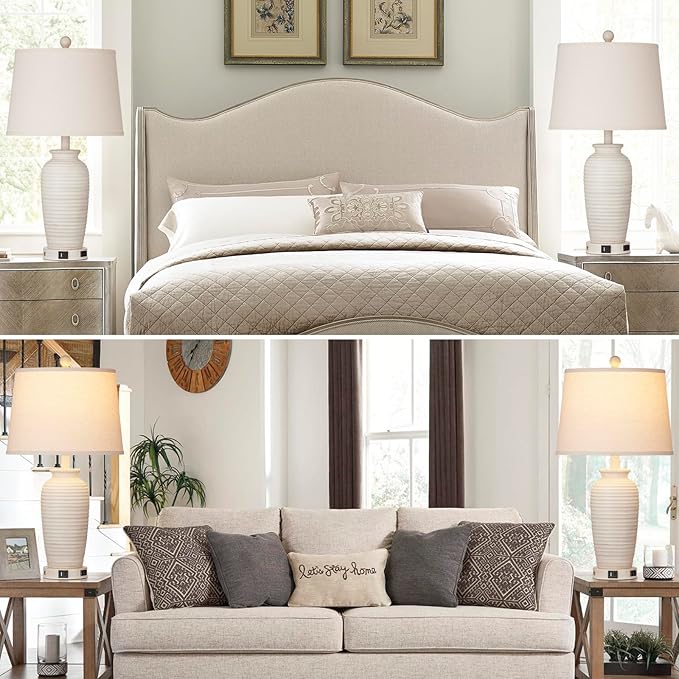 - 【Farmhouse Vintage Style Designs】This bedside table lamp is made of polyresin with a raised surface that adds a touch of texture, finished in a natural linen beige lampshade which is perfect combination of rustic and nature style that adds warm and elegance to your space. Our table lamps not only illuminate your home, but are a unique handicraft. It’s aslo a perfect gift to your friend!