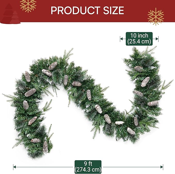 Joiedomi 9FT Christmas Flocked Garland (Cone) Pre Lit with 50 Count Warm White String Lights for Winter Christmas and Holidays, Decorated with Pine Cones, Plug in Lighted Pine Garland, Xmas Collection