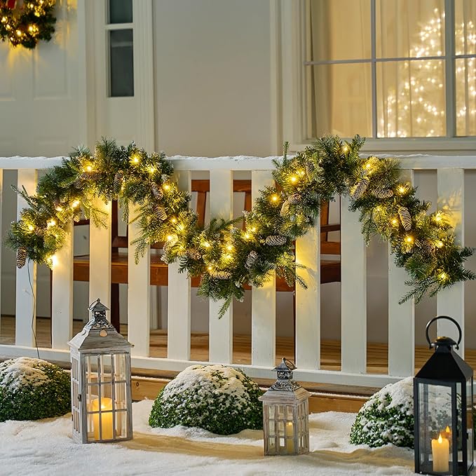 - PERFECT DECOR. Christmas Lighted Garland includes 9ft Chrsitmas Flocked Garland with Pine Cones, Prelit Garland with 50 Count Warm White String Lights. This Christmas Mantle Garland will make your Christmas set-up extra warm, lit and joyful.