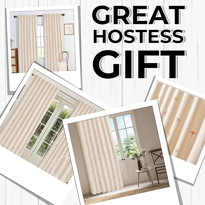 Natural Flax Linen Curtains 50x96 Inch –Brown Taupe with Dragonfly Embroidery, Room Darkening for Bedroom & Living Room