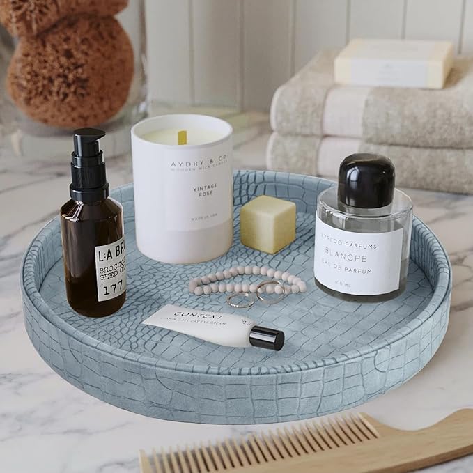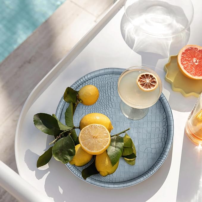 HofferRuffer Faux Leather Round Serving Tray, Vegan Croco Leather Decorative Tray, Food Tray for Storage Drinks, Snack & Cosmetics, Dia.12'' x 1.6'' (LightBlue)