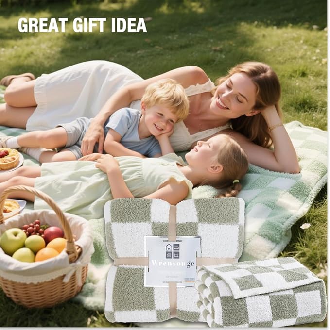 WRENSONGE Checkered Throw Blanket, Sage Green Soft Cozy Fluffy Warm Hand Made Throw Blankets for Couch, Sofa, Chair, Bed, Camping, Picnic, Travel Lightweight Bed Blanket - 90"*108"