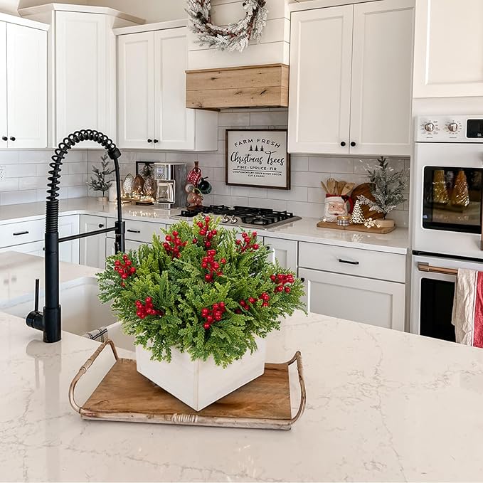 DILATATA Christmas Centerpieces 8 Inch Artificial Christmas Plant in Square Wooden Pot Tabletop Pine Plants with Red Berries Cedar Leaves for Winter Holiday Party Fireplace Mantel Xmas Decor