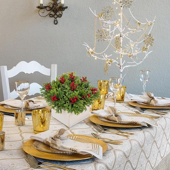 - Tabletop Christmas Plant: This verdant centerpiece decorates your dining table or sideboard with a flourish. Cedar leaves mixed with shiny red berries artfully arranged in a natural wooden box, add traditional holiday color and cheer to your home. The exquisite design makes this mini Christmas centerpiece become a perfect table decorations choice as well as a perfect gift