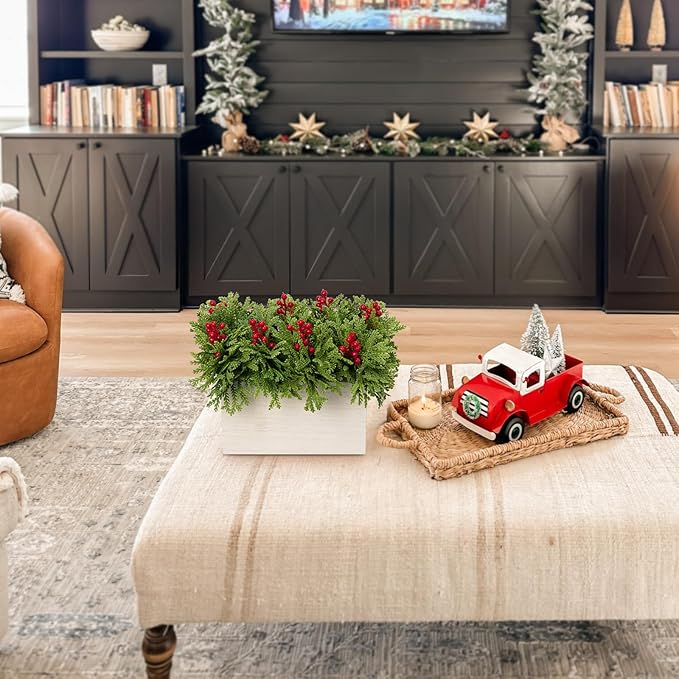 DILATATA Christmas Centerpieces 8 Inch Artificial Christmas Plant in Rectangular Wooden Pot Tabletop Pine Plants with Red Berries Cedar Leaves for Winter Holiday Party Fireplace Mantel Xmas Decor