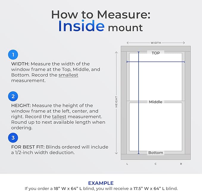 - WHAT SIZE TO ORDER: This blind will be exactly 15 inches wide to ensure the perfect fit inside a window frame that is 15.5 inches wide. All Lumino blinds are precision-cut to be ½" narrower than the ordered width, providing the ideal inside mount. Please measure carefully – see image with instructions to ensure the optimal fit. The sizes listed are WIDTH x HEIGHT.