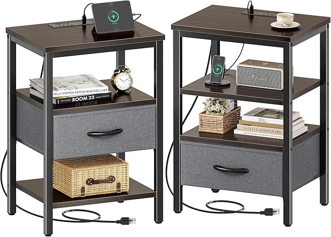 - 【Go for a Long Time】: Walnut shelves blend black metal frame and gray fabric drawer, making it a timeless classic. Sturdy P2 particle board, robust metal frame, and durable fabric drawer, all these work excellently to give this side table with charging station strong support