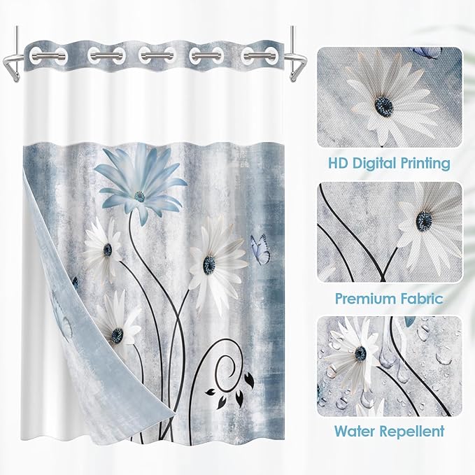 No Hook Rustic Farmhouse Shower Curtain with Snap in Fabric Liner Set, Blue Daisy Flowers and Butterfly on Country Wooden Double Layers Waterproof with See Through Top Bath Curtain 71x74 Inch
