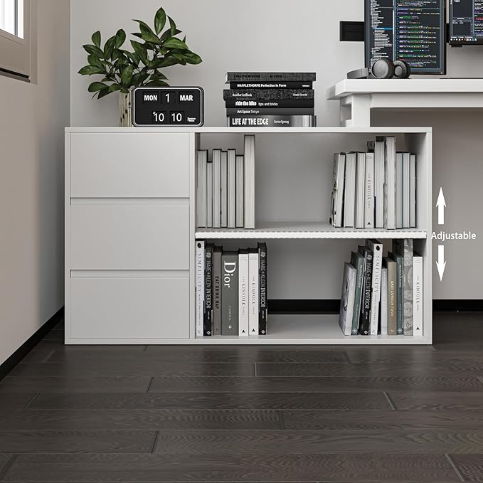 - Ample Storage Capacity: The L-shaped computer desk provides ample storage capacity. It features 3-heights adjustable of 2-tier open shelves for different heights item, offering convenient spaces for essential office supplies. The three drawers are also perfect for storing important files or personal belongings. This L shaped computer desk with drawers and shelves optimally utilizes your available space. Dimensions of the Cabinet: 41”L x 15.6”W x 24.8”H.