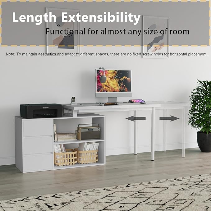 - Integrated Design: This L shaped desk with drawers and shelves is a great space saver, combining a desk and storage cabinet for easy access to all your belongings. The computer desk is changeable according to the usage scenario, you can put the cabinet on the right, left or assemble a long office desk.