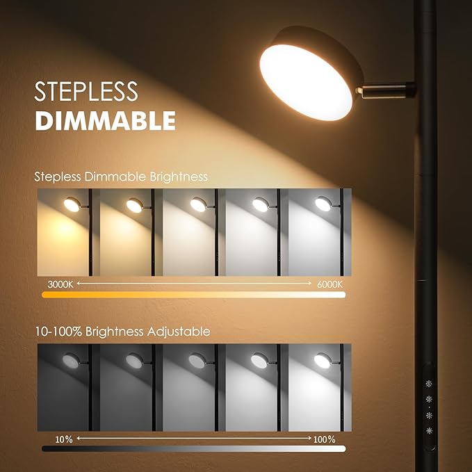 - 4 Color Temperature Dimmable Floor Lamp: The tall standing lamps have 4 color temperatures to choose from 3000k-4000K-5000K-6000K (warm white-neutral white-daylight white-cool white). The warm light gives you soft and warm feeling and can be used as a night light, ambient light, and the bright cool white light can be used for daily lighting or as a reading light, office lamp