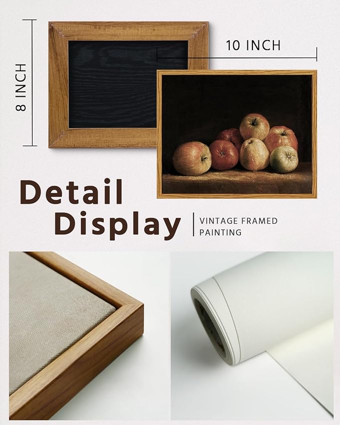 - Classic Vintage Design: The still life of apples artwork captures the essence of vintage charm, making it a perfect addition to any kitchen decor. The detailed depiction of apples and the subtle play of light and shadow evoke a sense of warmth and nostalgia.