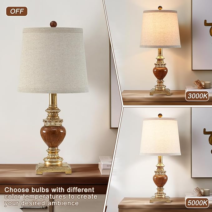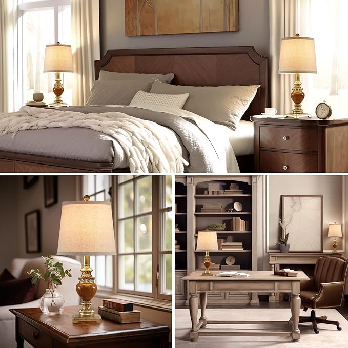 21'' Small Table Lamps for Bedroom Set of 2 Rustic Farmhouse Bedside Nightstand Lamps Traditional Side Table Lamps for Living Room Kids Home Office, Wooden Finish, Gold, Bulbs Not Include