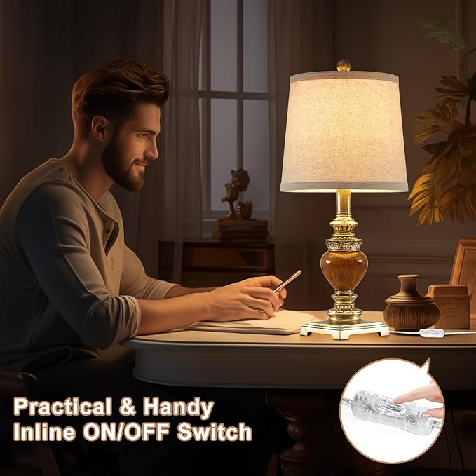 - 【Rustic Bedroom Lamps Set of 2】: Embrace the timeless charm of the Drawealth rustic table lamp. Its golden resin body is handcrafted by artisans and exudes rustic charm, while delicate wooden details add to the lamp's texture. The warm glow from the cream fabric shade creates a cozy atmosphere, these lamps are perfect for a bedroom, living room or cozy reading nook.