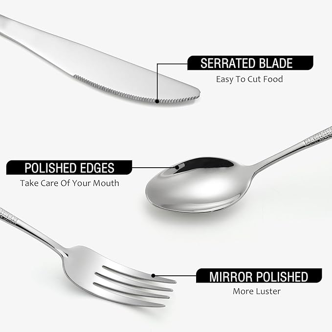 - 【High Quality Stainless Steel】This flatware set is made of high quality stainless steel, which is a sturdy material and easy to clean. It is mirror polished to give the set a glossy look and the edges of the silverware are polished smooth for a comfortable grip when in use.
