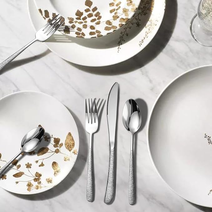 - 【Flatware Style】The hammered design on the handles of this flatware is simple, vintage and elegant. The vintage and simple cutlery set can be paired with most styles of napkins, tablecloths, or other tableware, etc.