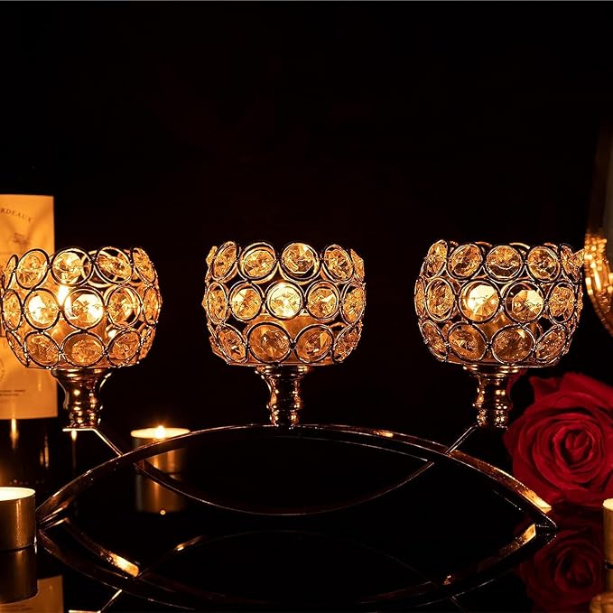 - ❤ Design of the Size:height:3 arm gold crystal candle holders, 14cm/5.51inch, length: 27.5cm/10.82inch. Upper candle cup diameter: 8.35cm/3.34inch, net weight: 0.65kg. Fits candle sizes up to 2.75 inches in diameter.