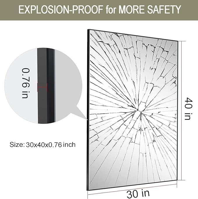 - BLACK WALL MIRROR: The 30"x40" black mirror is made of durable metal frame which is matte finished, with no frills or decoration. It's corrosion-resistant, waterproof and would not deformed, 5mm HD silver mirror and the
