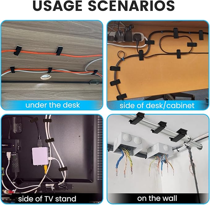 - 【Product usage scenarios and uses】suitable for almost all the cables. Fixed network cables on the wall . Cord Organizer For PC cable ,such as HDMI,Power Plug,Extension Cord, CAT-5,CAT-6,CAT-7,CAT-8,Ethernet Cable, TV Coax, Electric Wires,Cable Management Under Desk.Widely used in home, garden, garage and office.